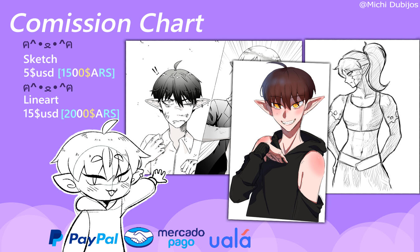 •Los derechos de cada producto que produzco son conservados por mí. Me está pagando para crear una imagen, no para transferir sus derechos.•Sólo tiene derecho a utilizar el producto final como uso personal (o sea, sin fines comerciales/no puede hacer dinero con él).•Tengo derecho a utilizar el producto como ejemplo para futuras comisiones si así el cliente lo permite.•Para pedir una comisión que sea con fines comerciales, contáctese conmigo (los precios y términos cambian en este caso).Si pide una comisión, voy a asumir que leyó y aceptó estos términos.¿Qué necesito para hacer tu comisión?